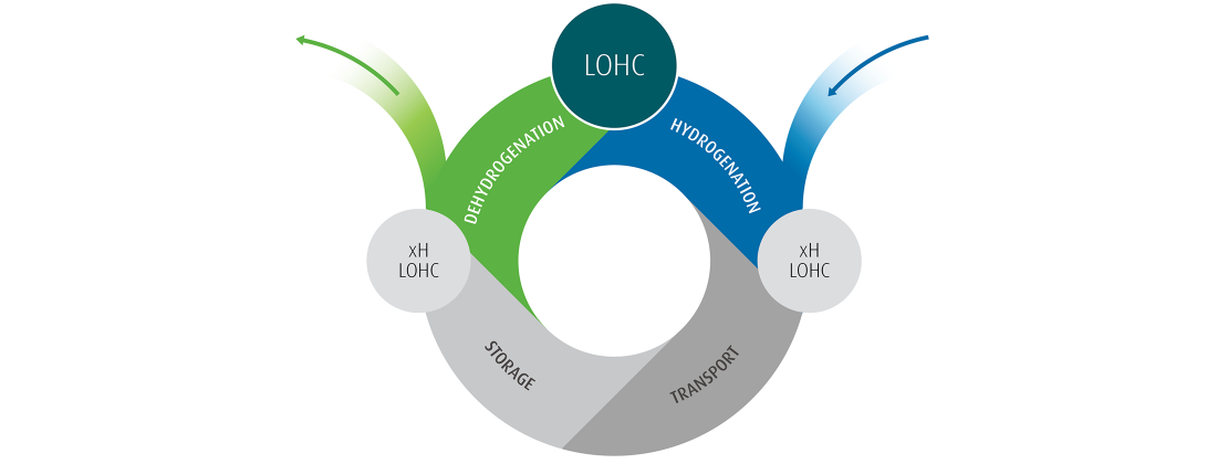 Green hydrogen – hydrogen created using renewable energy sources – is expected to be an important element in a future carbon-neutral economy. However, the transportation and storage of hydrogen is today mainly based on liquid compressed hydrogen, which has to be stored either at extremely high pressures (350-700 bar) or at extremely low temperatures (-253°C). The need for specialised handling and the insufficient infrastructure and refuelling networks for compressed hydrogen represent the main challenges for a more widespread use of hydrogen in the transport sector. Liquid Organic Hydrogen Carrier (LOHC) technologies provide an effective alternative solution by chemically bonding hydrogen to a stable organic liquid carrier, thereby eliminating the need for compression and making it safer, more practical and more cost-efficient to transport hydrogen using existing conventional fuel networks.